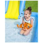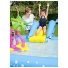 Игровой бассейн станет любимым местом веселой детворы летом на свежем воздухе. На площадке есть горочка, различные надувные игрушки в виде морских обитателей и чудесный фонтанчик. Бассейн и игрушки выполнены из прочного винила. Внутренний диаметр клапана бассейна 10 мм. Накачивается стандартным ручным или ножным насосом для надувных кругов и игрушек (не использовать воздушный компрессор высокого давления). Надувные дельфин и осьминог выполнены из цветного полупрозрачного винила, очень яркого и замечательно блестящего. Надувная горка привязывается шнурком через люверсы. Разбрызгиватель подводится через пальму и ребят ждет освежающий фонтанчик.