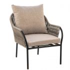 Выполнен из экоротанга, устойчивого к ультрафиолетовым лучам и атмосферным воздействиям. Лента искусственного ротанга напоминает шнур, модель штабелируется. Металлический каркас обеспечивает прочность и устойчивость, защищен от коррозии слоем порошковой краски.