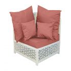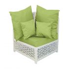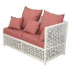 Алюминиевый каркас дивана окрашен порошковой краской для еще большей долговечности изделия. Диван выполнен из экоротанга, устойчивого к ультрафиолетовым лучам и атмосферным воздействиям. Цвет плетения - на ваш выбор. Диван дополнен мягкими элементами из высококачественной уличной ткани.