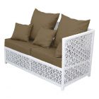 Алюминиевый каркас дивана окрашен порошковой краской для еще большей долговечности изделия. Диван выполнен из экоротанга, устойчивого к ультрафиолетовым лучам и атмосферным воздействиям. Цвет плетения - на ваш выбор. Диван дополнен мягкими элементами из высококачественной уличной ткани.