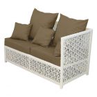 Алюминиевый каркас дивана окрашен порошковой краской для еще большей долговечности изделия. Диван выполнен из экоротанга, устойчивого к ультрафиолетовым лучам и атмосферным воздействиям. Цвет плетения - на ваш выбор. Диван дополнен мягкими элементами из высококачественной уличной ткани.