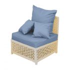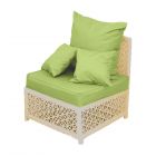 Алюминиевый каркас дивана окрашен порошковой краской для еще большей долговечности изделия. Диван выполнен из экоротанга, устойчивого к ультрафиолетовым лучам и атмосферным воздействиям. Цвет плетения - на ваш выбор. Диван дополнен мягкими элементами из высококачественной уличной ткани.