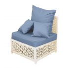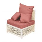 Алюминиевый каркас дивана окрашен порошковой краской для еще большей долговечности изделия. Диван выполнен из экоротанга, устойчивого к ультрафиолетовым лучам и атмосферным воздействиям. Цвет плетения - на ваш выбор. Диван дополнен мягкими элементами из высококачественной уличной ткани.