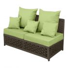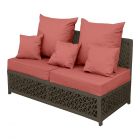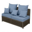 Алюминиевый каркас дивана окрашен порошковой краской для еще большей долговечности изделия. Диван выполнен из экоротанга, устойчивого к ультрафиолетовым лучам и атмосферным воздействиям. Цвет плетения - на ваш выбор. Диван дополнен мягкими элементами из высококачественной уличной ткани.