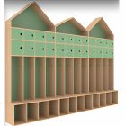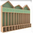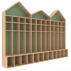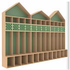 Лаконичный, но эффектный дизайн в стилистике волшебного городка,состоящего из разноуровневых домиков, погружающий ребенка в фантазийную атмосферу творчества с порога группы, имеет большую вариативность исполнений: с фасадами и без, из ЛДСП, фанеры, натурального дерева, с покрытием лаком, эмалью, с различными исполнениями зон хранения.