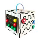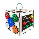 Небольшие размеры (сторона 23 см) позволяют взять бизикуб с собой в дорогу, к бабушке или на пикник. Игрушка деревянная, поэтому приятная на ощупь. Края и прорези сглажены и зашлифованы. Крепления вращающихся элементов стальные.