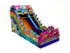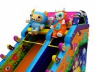 Наравне с яркой тематикой, надувная горка продумана с точки зрения безопасности: удобные ступеньки и плавный спуск, продолжительная зона торможения с мягкой стеной останова, безопасные борта в половину роста взрослого человека, защитная крыша стартовой площадки, делающая безопасным пребывание детей на вершине спуска.