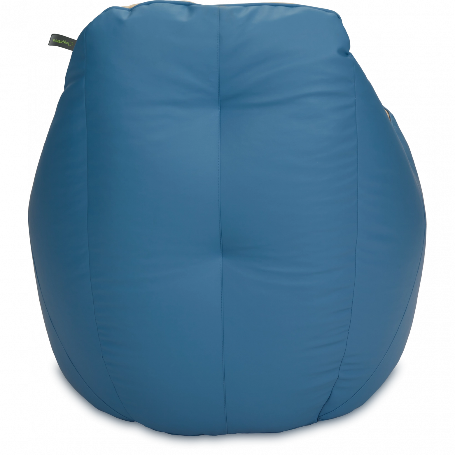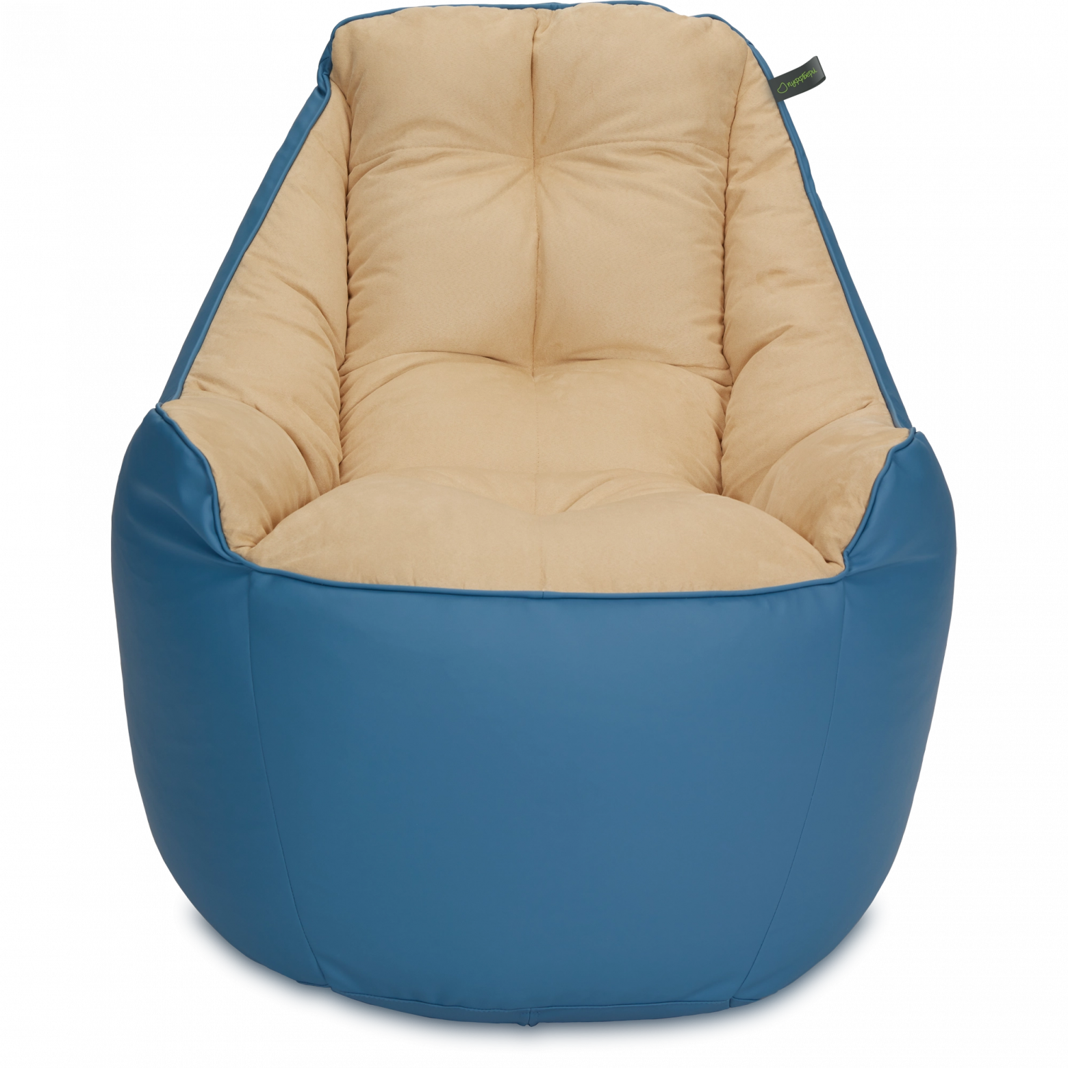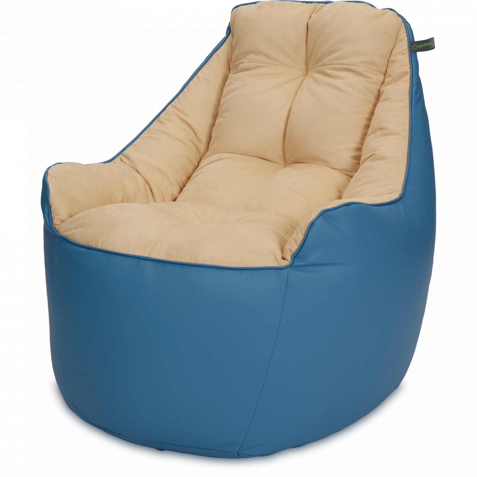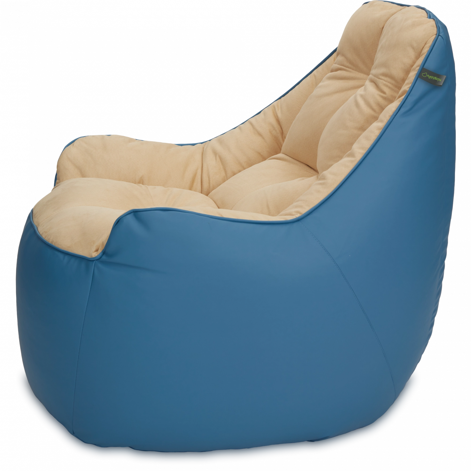 Размеры: 90x95x90 см.. Кресло сшито из мебельных тканей категории люкс: снизу искусственная ("дышащая") эко-кожа, сверху мягкая мебельная замша. Внутренний чехол: отсутствует. Цвет: Синий и бежевый. Наполнитель: сертифицированный мебельный полистирол, с размером фракции 2-5 мм (премиум). Безопасен для детей и животных. Мягкое бескаркасное кресло (мешок, бин бэг) в форме классического кресла с подлокотниками.