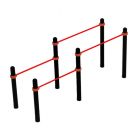 Брусья двойные представляют собой конструкцию, состоящую из шести вертикальных опорных столбов из круглопрофильной трубы, на которые устанавливаются - перекладины изготовленные из круглопрофильной трубы. Фиксация всех навесных на стойки элементов происходит с помощью стальных хомутов. Сварные швы всех элементов изделия тщательно обработаны и зачищены. Поверхность всех элементов изделия окрашена порошковым напылением в электростатическом поле. Вертикальные столбы бетонируются в грунт. Во все внешние отверстия труб брусьев - установлены пластиковые заглушки. Брусья поставляется разобранном виде.