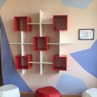 Настенная конструкция для проекта "Точка роста" составляется из полуоткрытых полок и квадратных ячеек с нишами.