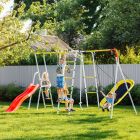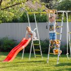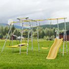 Конструкция выдерживает до 100 кг веса. Изделие оборудовано двумя качелями: моделью "лодка" и пластиковыми. Кроме того, имеются кольца, баскетбольный щит и лестницы лаза.