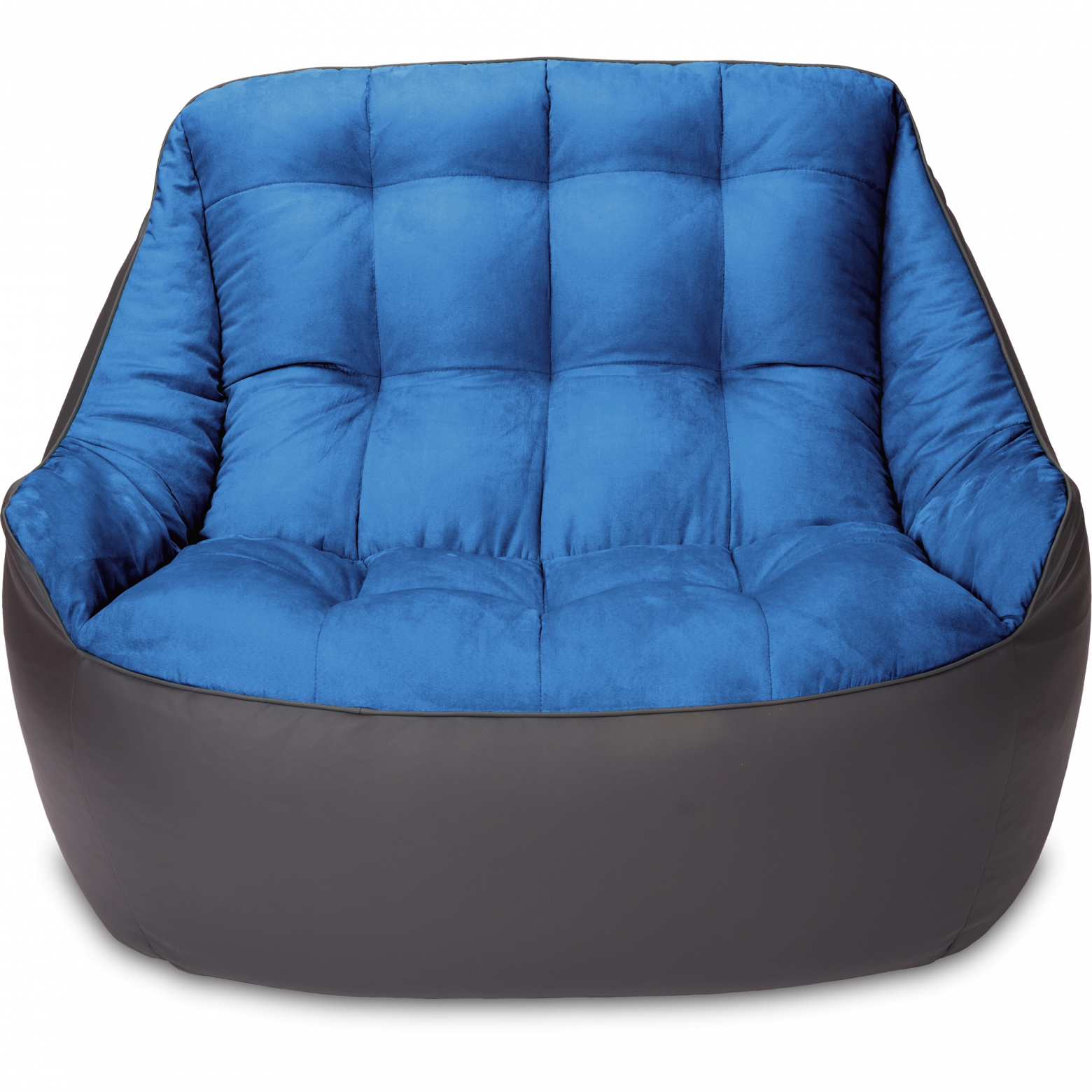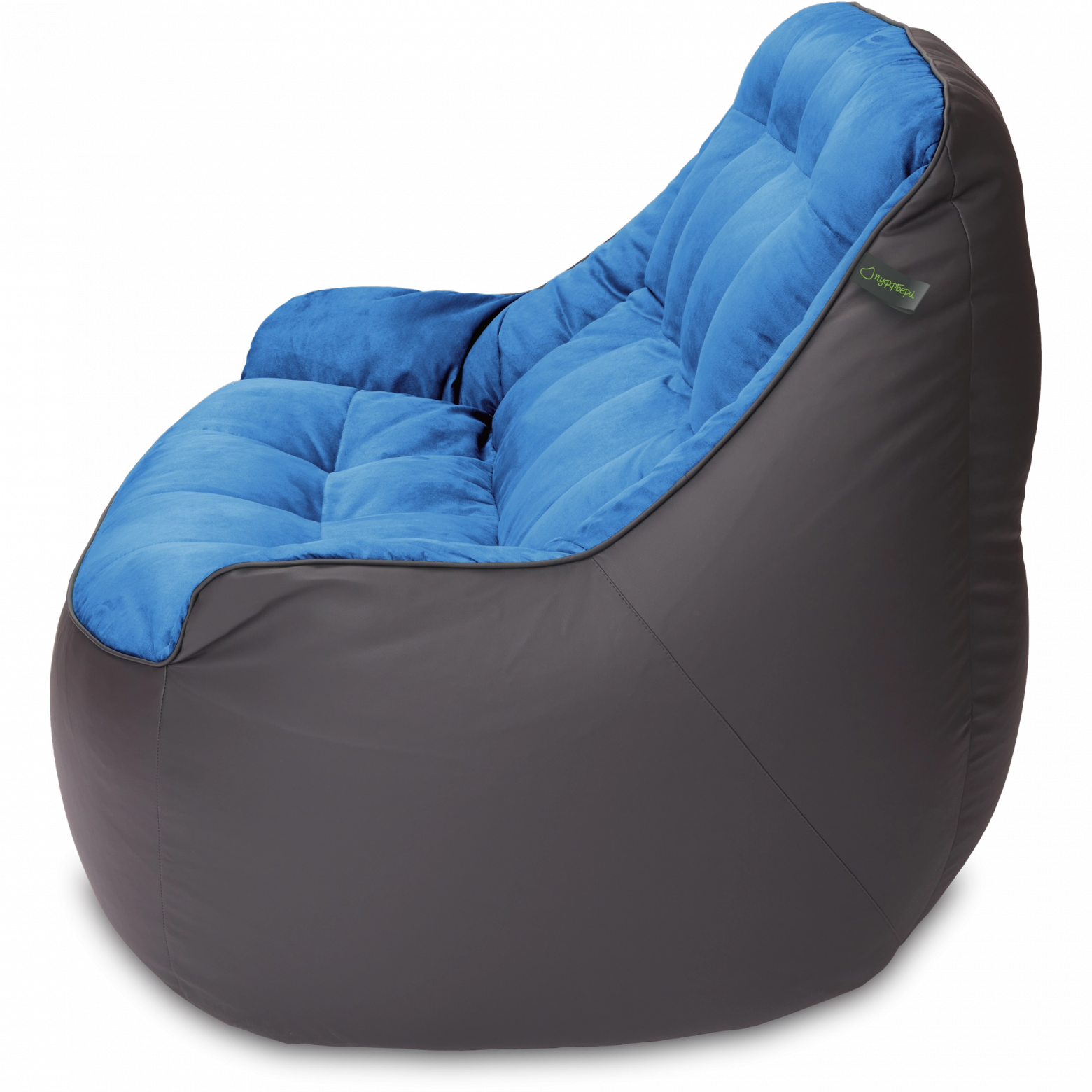 Размеры: 90x130x95 см.. Кресло сшито из мебельных тканей категории люкс: снизу искусственная ("дышащая") эко-кожа, сверху мягкая мебельная замша. Внутренний чехол: отсутствует. Цвет: Графит и голубой. Наполнитель: сертифицированный мебельный полистирол, с размером фракции 2-5 мм (премиум). Безопасен для детей и животных. Мягкое бескаркасное кресло (мешок, бин бэг) в форме классического дивана (софа) с подлокотниками.