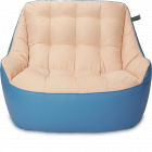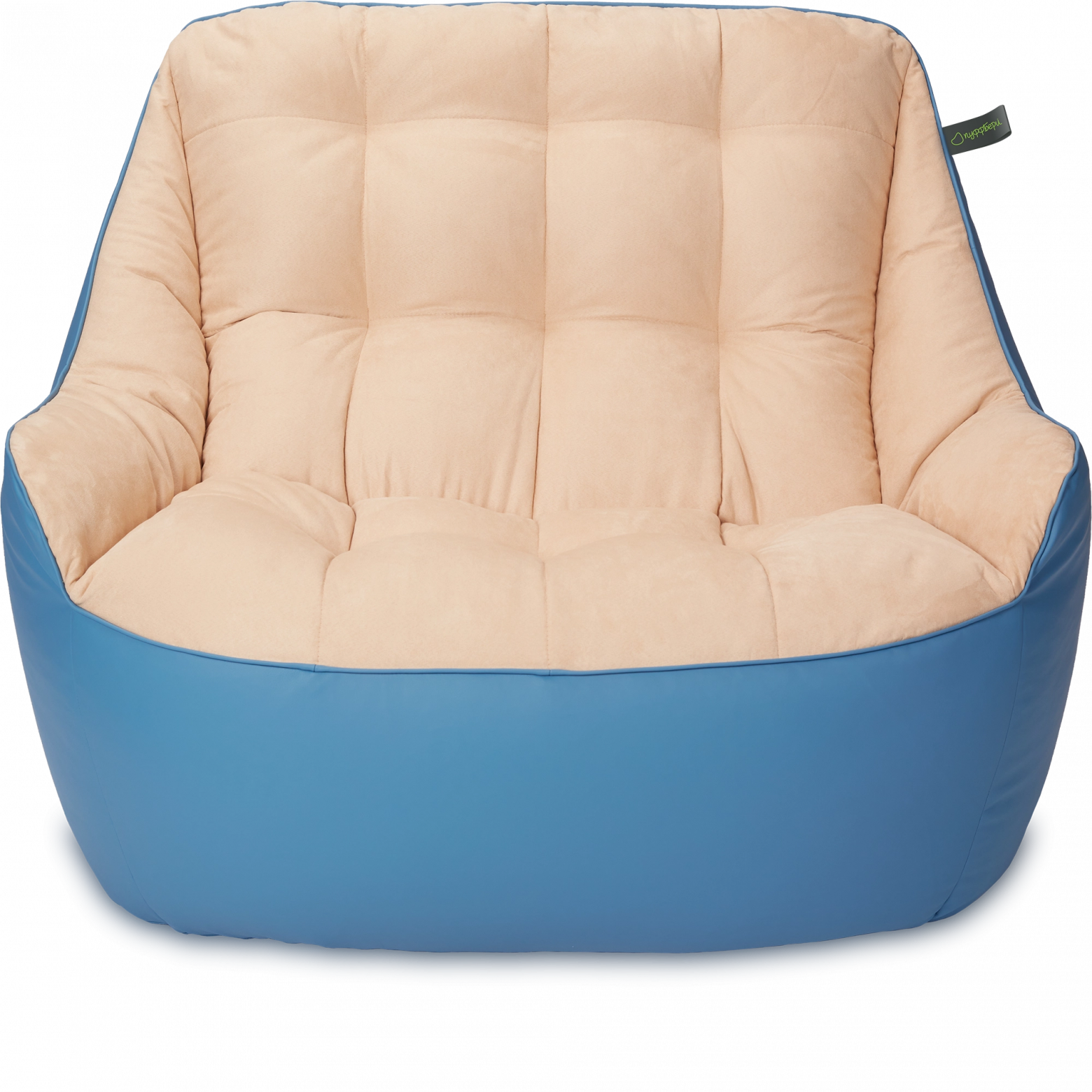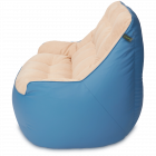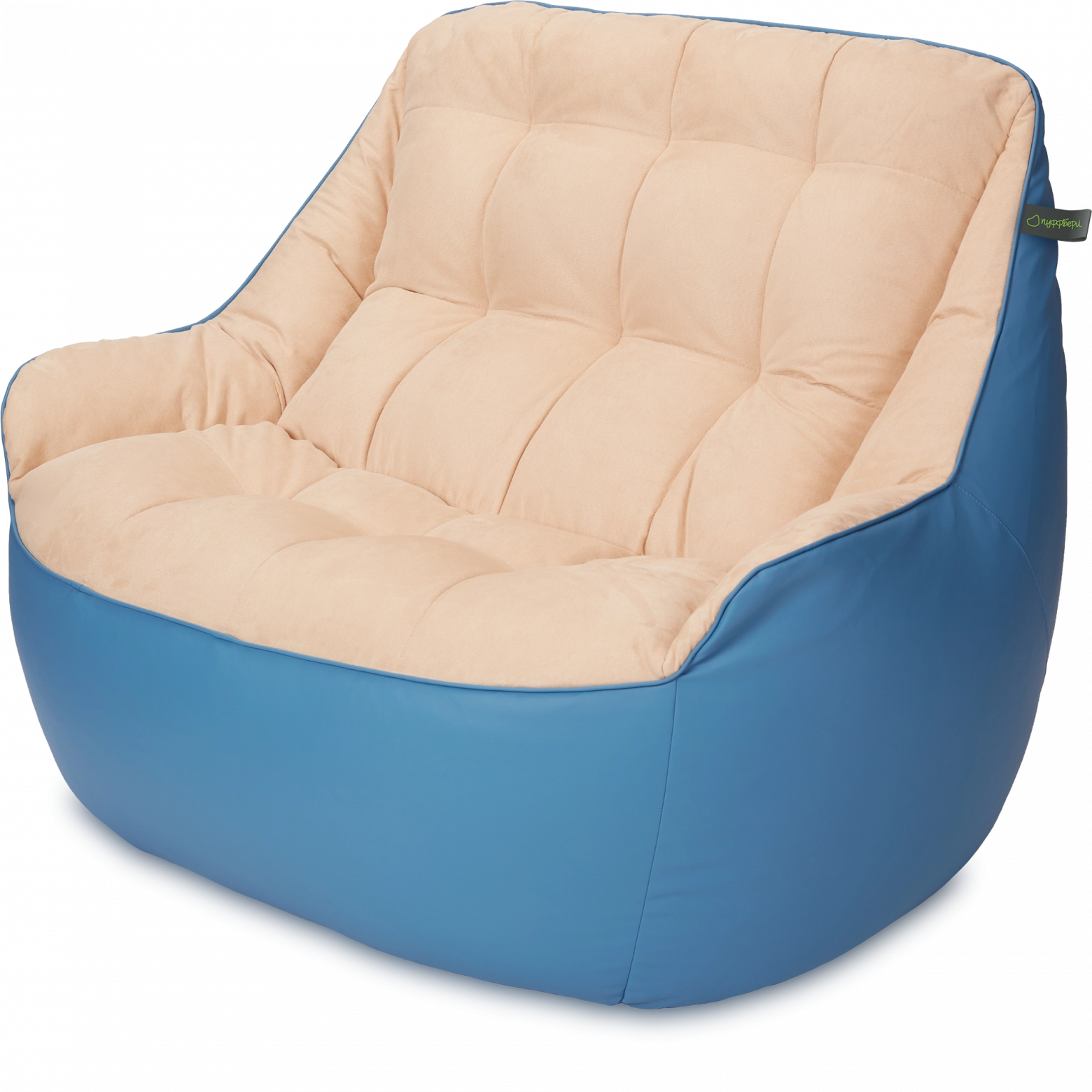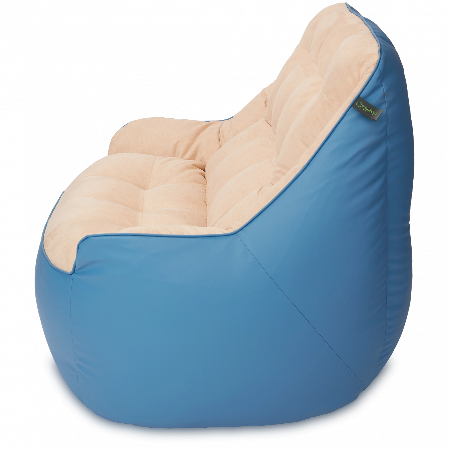 Размеры: 90x130x95 см.. Кресло сшито из мебельных тканей категории люкс: снизу искусственная ("дышащая") эко-кожа, сверху мягкая мебельная замша. Внутренний чехол: отсутствует. Цвет: Синий и бежевый. Наполнитель: сертифицированный мебельный полистирол, с размером фракции 2-5 мм (премиум). Безопасен для детей и животных. Мягкое бескаркасное кресло (мешок, бин бэг) в форме классического дивана (софа) с подлокотниками.