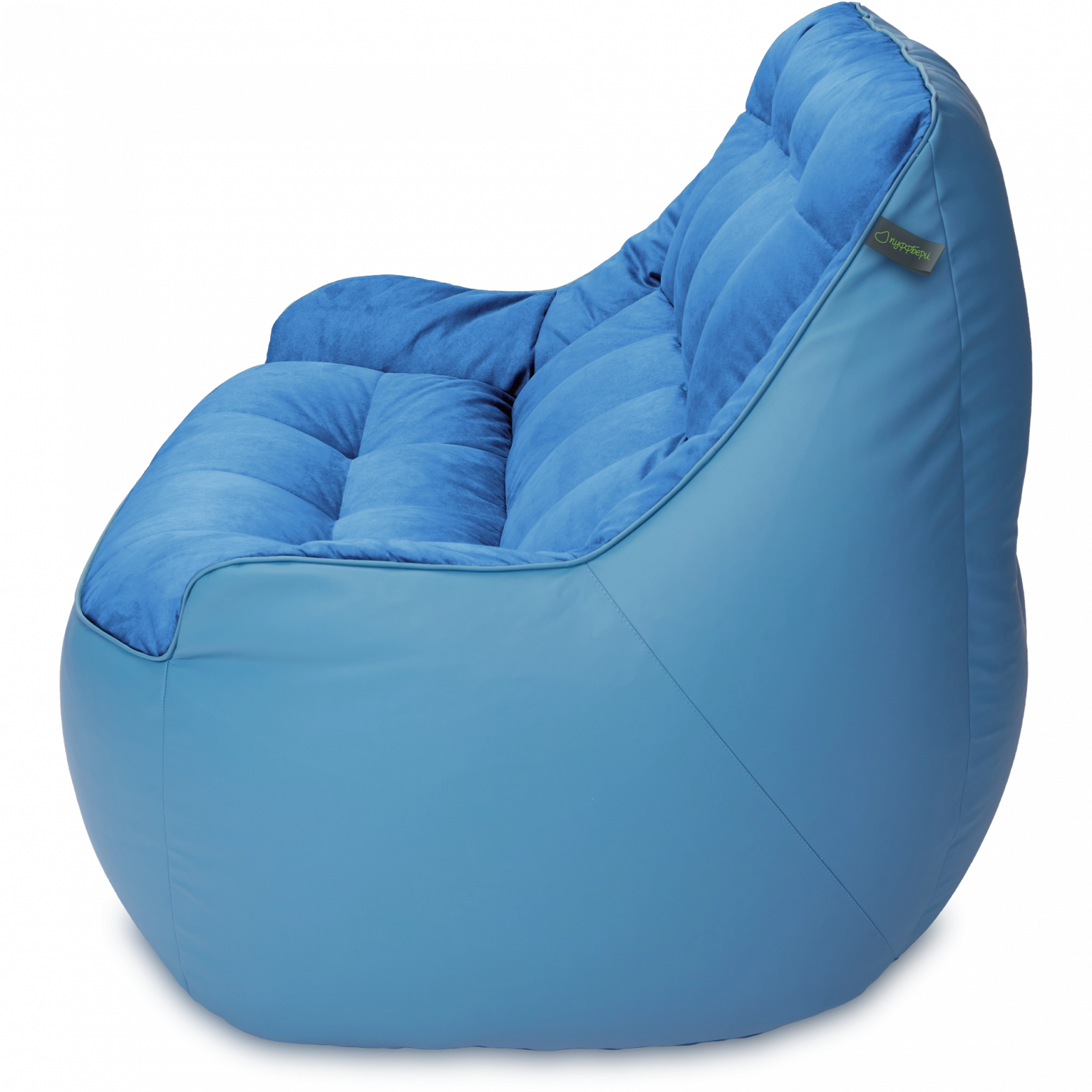Размеры: 90x130x95 см.. Кресло сшито из мебельных тканей категории люкс: снизу искусственная ("дышащая") эко-кожа, сверху мягкая мебельная замша. Внутренний чехол: отсутствует. Цвет: Синий и голубой. Наполнитель: сертифицированный мебельный полистирол, с размером фракции 2-5 мм (премиум). Безопасен для детей и животных. Мягкое бескаркасное кресло (мешок, бин бэг) в форме классического дивана (софа) с подлокотниками.