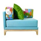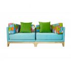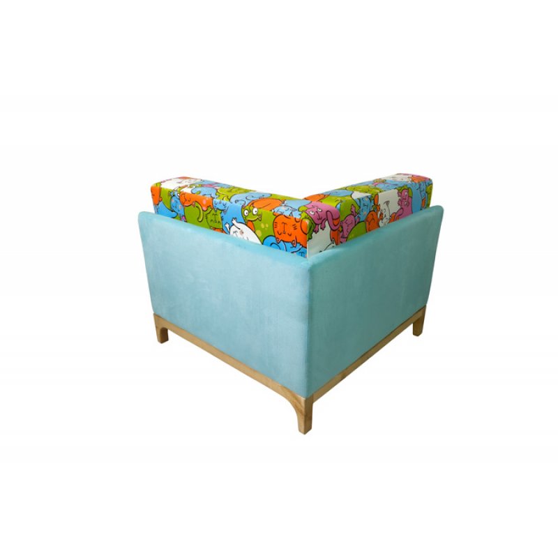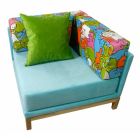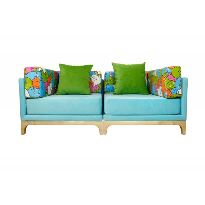 В детском саду для обустройства игровой комнаты можно приобрести детский диван. Мягкий наполнитель позволит комфортно расположиться на диванчике. Детский предмет интерьера состоит из деревянного каркаса (некоторые элементы обтянуты текстилем). Сиденье представлено прямоугольной подушкой, которую можно убрать. Также в комплект входят 2 подушки, расположенные вдоль спинки и 2 декоративные подушки.