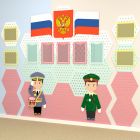 - Уголок выполнен в нежных пастельных тонах, которые создают благоприятную психологическую обстановку, а также привлекают внимание детей. На фигурах военных присутствуют элементы бизиборда, которые можно использовать в качестве дополнительного материала для развития познавательных процессов дошколят.