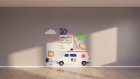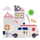 На стенде изображены здания: домик с двумя открывающимися окошками и здание с карманами для размещения информации. В качестве дополнительного декора — машина скорой помощи вращающимися колесами и шестеренками, градусник, пластырь и зеленый микроб. А также медицинский работник в белом халате с планшетом, градусником, шестеренками, бегунками и тактильными элементами.