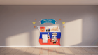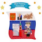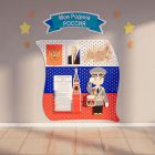Патриотический стенд с изображением государственной символики: настенная панель в виде официального флага Российской Федерации, бизиборд «Часовой» с бегунками, шестеренками и спицами с гайками, здание Кремля, информационный карман А4, где Вы можете разместить любой информационный материал, а также карта нашей Родины — России.