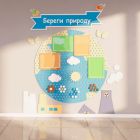 Информационный стенд имеет 4 кармана А4, где можно разместить любую информацию, круглую панель в цветах нашей планеты, облачка, солнце и цветы из маленьких бусинок, которые могут перемещаться в панели и из них можно соорудить что угодно — все, на что хватит фантазии. В качестве дополнительного декора рядом размещены городские здания и дымовые трубы со значком радиации.