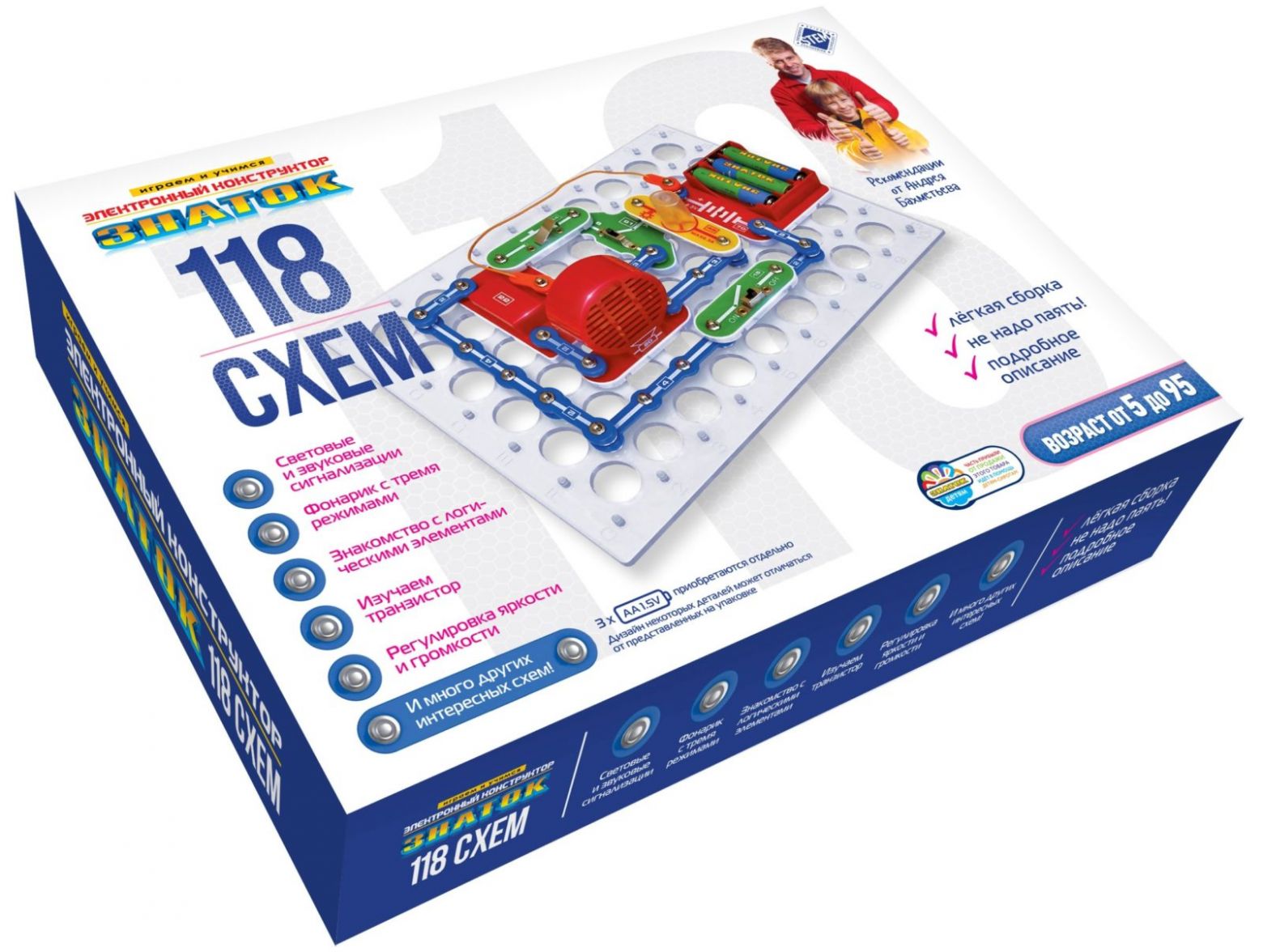 Электронный конструктор начального уровня, позволяющий ребёнку познакомиться с удивительным миром электроники. Даже без помощи взрослых, используя очень понятное цветное руководство, всего за несколько минут, он или она смогут собрать и испытать схему с практически 100% положительным результатом и удивить родителей, друзей, учителей.