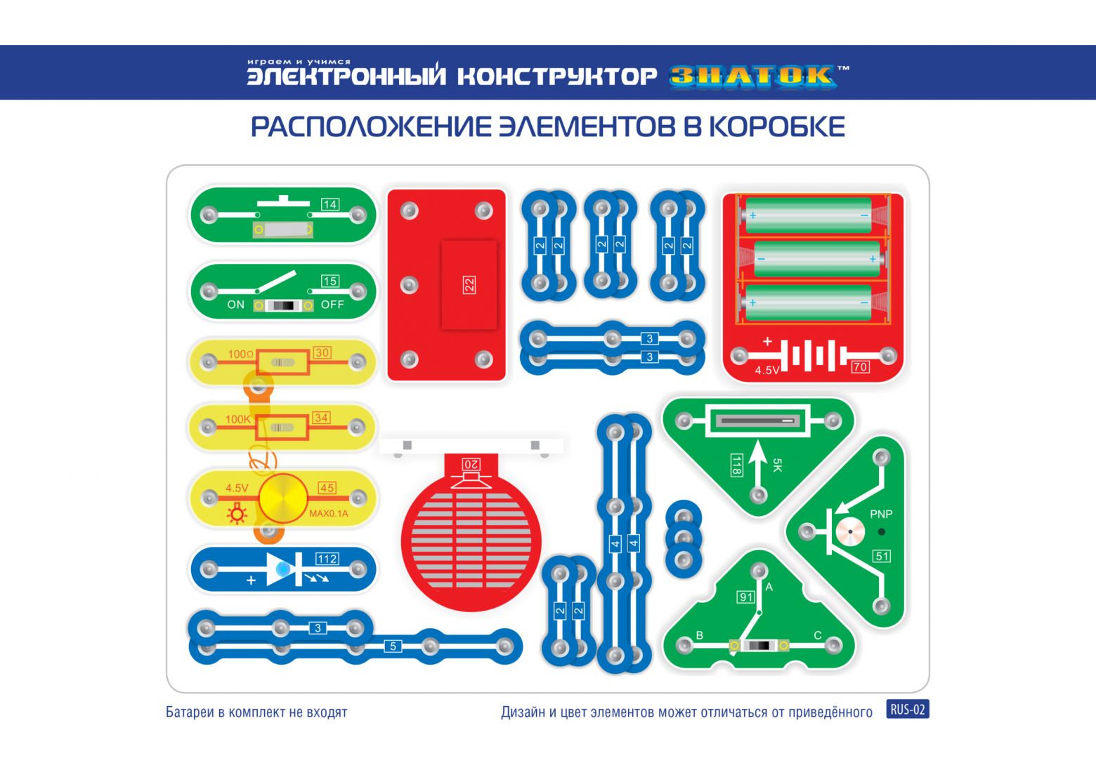 Помимо этого в «Руководстве пользователя» вы найдёте перечень элементов конструктора. Для удобства собирания деталей в коробку мы приводим схему расположения элементов.