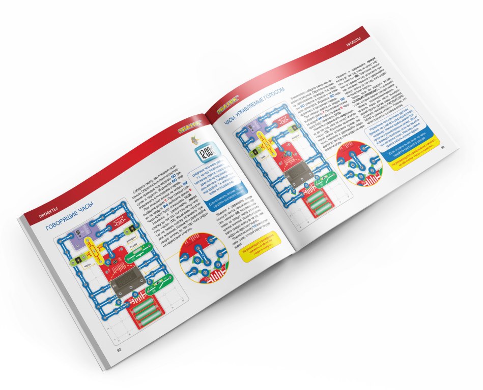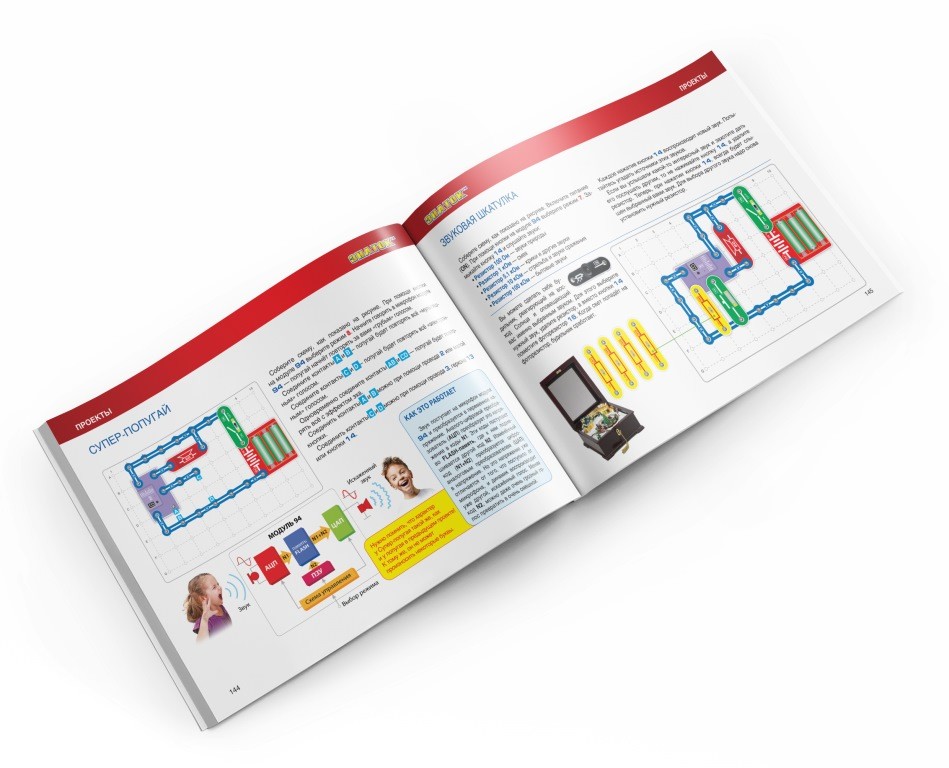 К конструктору прилагается цветное «Руководство пользователя» по сборке различных проектов. Помимо этого в прилагаемой книге вы найдёте перечень и описание элементов конструктора. Для удобства собирания деталей в коробку на последней обложке приведена схема расположения элементов.