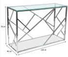 Вес, кг: 21 / Высота (см): 78 / Гарантия, мес.: 12 / Глубина (см): 40 / Количество коробок: 1 / Материал каркаса: металл / Материал столешницы: стекло / Необходимость сборки: да / Раздвижной: нет / Размер упаковки 1: 1,3/0,85/0,15 / Страна производитель: Китай / Форма столешницы: прямоугольник / Цвет каркаса: серебро / Цвет столешницы: прозрачный / Ширина (см): 120