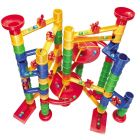 • В набор входят кубики разных размеров и цветов, воронки, вертушки, шарики, желоба для постройки горки, руководство по сборке.