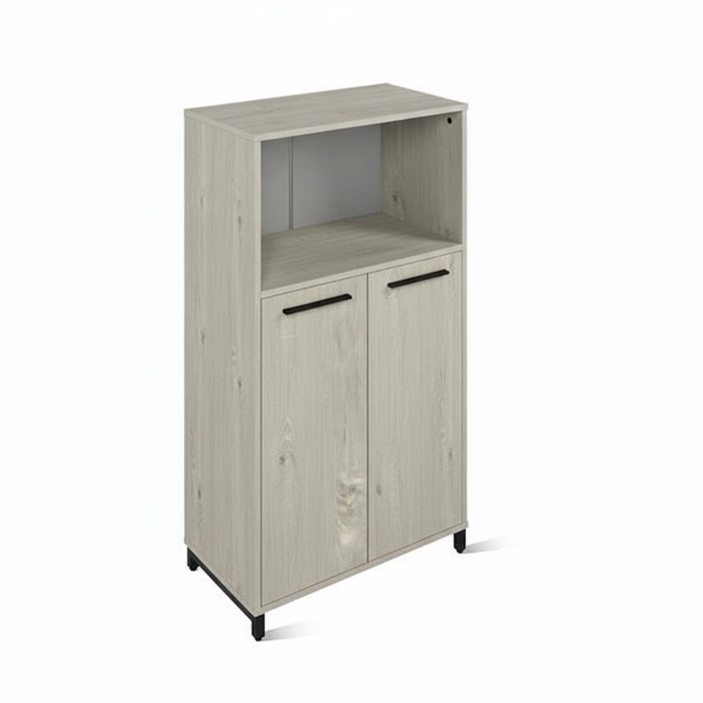 Изделие состоит из металлических опор, открытой секции и закрытой секции с двумя дверьми. В закрытой секции предусмотрена полка, регулируемая по высоте с шагом 32 мм. Детали шкафа изготовлены из ЛДСП толщиной 16 мм. Все элементы изделия облицованы ударопрочной кромкой ПВХ 0,4 и 2 мм. Задняя стенка изготовлена из ДВПо толщиной 3 мм. Детали шкафа соединены между собой евровинтами и эксцентриковыми стяжками. На фасады шкафа устанавливаются мебельные петли с доводчиком, что способствует плавному закрыванию. На фасады устанавливаются металлические ручки 160 мм. Секция шкафа устанавливается на металлическую опору высотой 65 мм. Опора изготовлена из стального профиля 25х25 мм и 20х20 мм с толщиной стенки 1,2 мм. На опорах установлены пластиковые заглушки с регулируемыми подпятниками М8. Все металлические части покрыты полимерно-порошковой краской. Для изготовления шкафа используется ЛДСП высококачественного класса эмиссии Е1 и качественные комплектующие российских и зарубежных производителей.