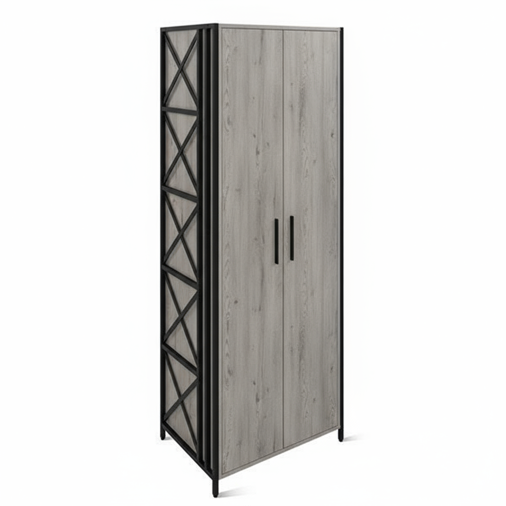 Удачное решение для вашего интерьера. Шкаф оборудован штангой для хранения одежды на плечиках и полкой для головных уборов. Оптимальная глубина шкафа позволяет хранить одежду и аксессуары в большем количестве. Стильные чёрные металлические ручки и цвет дерева Дуб Канадский гармонично вписываются в любой интерьер. Графичность модели определяют ножки из металлических стоек с иксобразными элементами. Крепление боковых стоек универсальное, поэтому вы можете их переворачивать как вам удобно, располагая вертикальные профили спереди или сзади. Несколько шкафов легко стягиваются между собой и образуют удобную систему хранения.