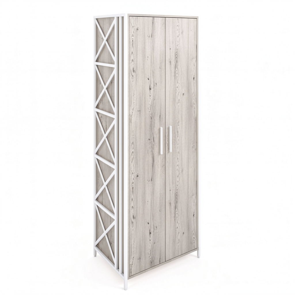 Удачное решение для вашего интерьера. Шкаф оборудован штангой для хранения одежды на плечиках и полкой для головных уборов. Оптимальная глубина шкафа позволяет хранить одежду и аксессуары в большем количестве. Стильные чёрные металлические ручки и цвет дерева Дуб Канадский гармонично вписываются в любой интерьер. Графичность модели определяют ножки из металлических стоек с иксобразными элементами. Крепление боковых стоек универсальное, поэтому вы можете их переворачивать как вам удобно, располагая вертикальные профили спереди или сзади. Несколько шкафов легко стягиваются между собой и образуют удобную систему хранения.