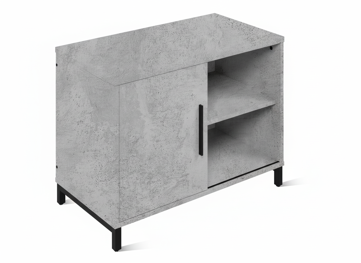 Современный дизайн и практичное решение. Тумба под оргтехнику оборудована слайдерной дверью и полкой. Перемещайте дверь как удобно вправо и влево. Сочетание открытых и закрытых отделений позволяет организовывать удобное хранение пультов и других аксессуаров, офисной бумаги, картриджей для принтеров. Прочный материал крышки выполнен из ЛДСП толщиной 22 мм делает придает тумбе презентабельный вид. Корпус, исполненный в цвете дерева Бетон, гармонично вписывается в любой интерьер. Благодаря лаконичному дизайну тумба прекрасно сочетается с мебелью из серии ЛОФТ и другими стилями.