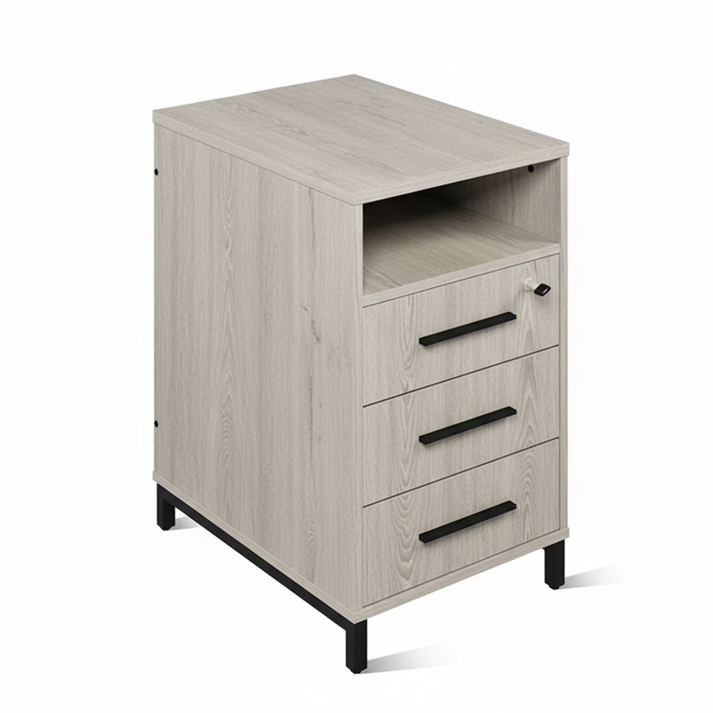 Каркас тумбы изготовлены из ЛДСП толщиной 16 мм. Крышка тумбы изготовлена из ЛДСП толщиной 22 мм. Все элементы изделия облицованы ударопрочной кромкой ПВХ 0,4 и 2 мм. Дно ящиков – ДВПО толщиной 3 мм. Тумба оснащена нишей высотой 144 мм, ящиками – 150 мм – 3 шт. Детали тумбы соединены между собой эксцентриковыми стяжками, евровинтами и винтами. Для плавного выдвижения ящиков применены роликовые направляющие. На фасады ящиков устанавливаются металлические ручки 160 мм. Верхний ящик оснащен замком. Тумба устанавливается на металлическую опору высотой 90 мм. Опора тумбы изготовлена из стального профиля 25х25 мм и 20х20 мм с толщиной стенки 1,2 мм. На опорах установлены пластиковые заглушки с регулируемыми подпятниками М8. Все металлические части покрыты полимерно-порошковой краской. Использование тумбы возможно со столами эргономичными, а также с другими изделиями серии «Лофт». Для изготовления тумбы используется ЛДСП высококачественного класса эмиссии Е1 и качественные комплектующие российских и зарубежных производителей.