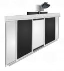 Слева и справа от интерактивной доски стационарно в стену крепятся две аудиторные доски. Еще две аудиторные доски крепятся в направляющий верхний профиль через систему кареток и имеют свободный ход. При необходимости преподаватель может закрыть интерактивную доску сдвинув их к центру либо раздвинуть их и работать на интерактивной доске.