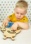 Бизиборд и развивающие элементы выполнены из качественной фанеры. В процессе производства все детали шлифуются вручную, поэтому поверхность элементов и полотна – гладкие, без зазубрин и безопасны для детей.