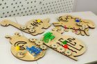 На каждом бизиборде есть несколько деталей, которые выполнены в ярком цвете для привлечения внимания детей, а сами развивающие элементы выбраны с учетом возрастных особенностей детей дошкольного возраста.