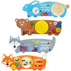 В комплект входит 4 бизиборда: «Мишка», «Зайка», «Лисичка», «Волчок». Детям знакомы эти сказочные животные. Малыши их не боятся, сразу проявляют любопытство и начинают осваивать новые навыки и умения. Ознакомьтесь с развивающими модулями игровых панелей и их полезными функциями.