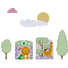 Декоративно-развивающая панель «Зоопарк» с дополнительным декором — большим и маленьким деревьями, солнышком и облаками.