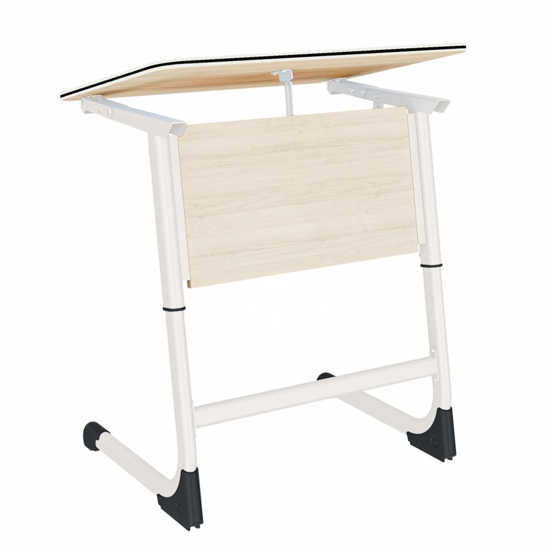 Стол "Mega Smart" предназначен для использования в качестве ученического стола для работы одного или двух учащихся, или в качестве письменного офисного стола для работы одного человека. Изделие регулируется по высоте рабочей поверхности в пределах трех ростовых групп учащихся (3-5, 4-6, 5-7 группы роста). Изделие имеет регулировку угла наклона столешницы. Изделие имеет разборную конструкцию, состоящую из двух металлических боковых опор (левой и правой), нижней перемычки , соединяющей опоры в нижней части, верхней царги (экрана) из ЛДСП, столешницы из композитного материала толщиной 22 мм. Опоры соединены с верхней царгой (экраном) с помощью мебельных эксцентриковых стяжек. Столешница присоединена к верхним кронштейнам опор с помощью винтов через резьбовые футорки согласно схеме присадки. Столешница крепится с помощью механизма регулировки угла наклона. Боковая опора состоит из верхней и нижней части, которые установлены друг в друга и соединены винтами. Между трубами в месте соединения установлены пластиковые центрирующие втулки. Регулировка высоты осуществляется с помощью переустановки винтов в резьбовые отверстия, соответствующие ростовым группам. Верхняя часть изготовлена из профильной трубы овального сечения 45х25х1,5мм , трубы 20х20х1,2 и верхнего кронштейна из гнутого листового металла. Все детали верхней части опоры соединены с помощью сварки. В трубе 20х20х1,2 размещены резьбовые отверстия М6 для крепления царги. Нижняя часть опоры изготовлена из профильной трубы овального сечения 45х25х1,5мм , которая согнута из единого фрагмента трубы методом холодной дорновой гибки под углом 100° (R100мм) и представляет собой L-образную деталь, в которой размещены резьбовые отверстия на уровнях, соответствующих ростовым группам. В местах изгибов отсутствует гофра, разрывы и изломы. На внешний радиус изгиба трубы приварен кронштейн из листового гнутого материала (бугель) и установлена пластиковая угловая опора, которая закреплена к кронштейну с помощью винта. На открытом торце в нижней части опоры установлен пластиковый опорный наконечник. Нижняя перемычка изготовлена из профильной трубы овального сечения 40х20х1,5мм, к торцам которой приварены металлические фланцы толщиной 4мм с отверстиями для крепления к боковым опорам с помощью винтов. Стандартная цветовая гамма столешницы: бук, серый, белый, клен шелковистый (только на МДФ и Фанера). Остальная цветовая гамма рассчитывается индивидуально.