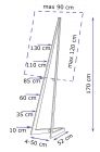 Полная высота мольберта 170 см. Глубина – это то, на сколько ножки уходят назад – 52 см. Ширина в рабочем состоянии плавающая, но наиболее красив и устойчив мольберт с размахом в нижней части около 40-50 см.