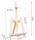 ]Полная высота мольберта – 80 см. Ширина – 40 см. Толщина в сложенном состоянии – 12 см (с учетом выступающих полочек). В разложенном состоянии в глубину мольберт займет до 30 см: именно на такое расстояние может отодвинуться задняя ножка от передних.