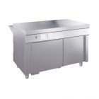 - Под столешницей расположена тумба с дверями-«купе» для хранения посуды и инвентаря, тем самым экономя пространство и обеспечивая безопасность в обслуживании