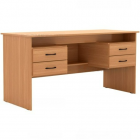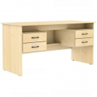 Стол изготовлен из ЛДСП 16мм, торцы столешницы отделаны противоударной кромкой ПВХ 1 мм. Для дополнительной жесткости конструкции под столешницей предусмотрена царга. Стол комплектуется полкой и двумя подвесными тумбами с ящиками на роликовых направляющих.