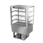 Холодильная витрина – встраиваемая, кубической формы, с нижним расположением испарителя. Боковые стенки витрины выполнены из стеклопакетов. Витрина имеет 3 стеклянные полки для выкладки продуктов и готовых блюд, а также нижнюю поверхность, состоящую из быстросъемных панелей, на которую также возможно размещать продукты и готовые блюда. Вместо панелей можно установить две гастроемкости GN-1/1 максимальной глубиной 150 мм. Со стороны покупателей витрина имеет маятниковые двери, а со стороны обслуживающего персонала – двери-купе из стеклопакетов, обеспечивающих хорошую теплоизоляцию. Внутренний объем витрины равномерно охлаждается эффективной динамической системой, оснащенной 2-я мощными вентиляторами. Подсветка полок осуществляется светодиодными светильниками, которые включаются при включении витрины.