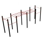 Рукоход классический двухуровневый и 6 турников представляет собой конструкцию, состоящую из десяти вертикальных опорных столбов из круглопрофильной трубы, на которые устанавливаются - перекладины и рукоходы изготовленные из круглопрофильной трубы. Фиксация всех навесных на стойки элементов происходит с помощью стальных хомутов. Сварные швы всех элементов изделия тщательно обработаны и зачищены. Поверхность всех элементов изделия окрашена порошковым напылением в электростатическом поле. Вертикальные столбы бетонируются в грунт. Во все внешние отверстия труб комплекса - установлены пластиковые заглушки. Комплекс поставляется разобранном виде.
