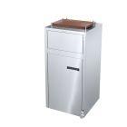 - Комплектуется выкатной мусорной емкостью на 4-х колесах, с рамкой, надежно фиксирующей мусорный пакет