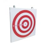 Щит для метания в цель - представляет собой изделие изготовленное из фанеры. На щит наклеена мягкая изолоновая подложка и обтянут разноцветным тентовым банером. Щит из фанеры оборудован металлическими крюками для навешивания на гимнастическую / шведскую стенку. Поверхность крюков окрашена порошковым напылением в электростатическом поле. Имеет разметку из прицельных кругов, разного цвета и диаметров.