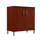Шкаф низкий с глухими малыми дверьми. Каркас выполнен из ЛДСП толщиной 25мм., кромка ПВХ т. 2мм.  Задняя стенка из ХДФ т.3,2мм. Внутренние полки из ЛДСП 18мм., кромка ПВХ т.0,8 мм. Верхняя и нижняя панель из ЛДСП т 25мм., кромка ПВХ т. 2 с фасадной стороны, кромка ПВХ т. 0,8 с трех сторон. Двери вкладные, из ЛДСП т. 18мм., кромка ПВХ т. 0,8мм. Ручка скоба, цвет алюминий.  Комплектуется замком.