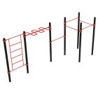 Спортивный комплекс №5 представляет собой конструкцию, состоящую из семи вертикальных опорных столбов из круглопрофильной трубы, на которые устанавливаются - перекладины и рукоходы изготовленные из круглопрофильной трубы. Фиксация всех навесных на стойки элементов происходит с помощью стальных хомутов. Сварные швы всех элементов изделия тщательно обработаны и зачищены. Поверхность всех элементов изделия окрашена порошковым напылением в электростатическом поле. Вертикальные столбы бетонируются в грунт. Во все внешние отверстия труб комплекса - установлены пластиковые заглушки. Комплекс поставляется разобранном виде.