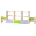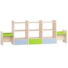 Стеллаж двухсторонний : ЛДСП, длина - 2650 мм, глубина - 450 мм, высота - 900 мм. Продукция имеет надлежащие сертификаты качества. Удобная и вместительная модель с большими выкатными ящиками, открытыми полками, куда Вы можете поставить игрушки, книги, демонстрационный материал и другие пособия для занятий. А оригинальное оформление стенки поможет создать в игровой комнате яркую, красочную и интересную обстановку. Материал исполнения: ламинированная ДСП толщиной 16 мм, цвет — Дуб молочный, все торцы обработаны кромкой ПВХ. Все выступающие углы скруглены по радиусу 50 мм. Имеет крепление стеллажа к стене. Цветовое разрешение возможно по желанию заказчика.